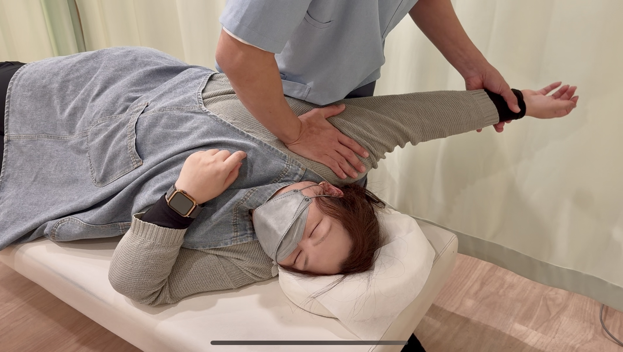 肩こりの多くは「表面の筋肉」ではなく「深層筋の緊張」が原因です。深層筋は手では触りにくく、自分では伸ばせないため悪循環が続きます。中の可動性を高めるために、胸椎や肋骨の可動域改善も行います。